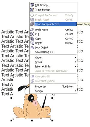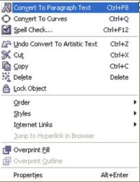 Textul Artistic poate fi transformat in Paragraph Text si invers, fie din meniul Text (selectind optiunile Convert to Artistic Text sau Convert to Paragraph Text), fie apasand combinatia de taste Ctrl+F8, fie selectand optiunea dorita printr-un clic dreapta pe text.