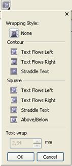 Aceasta optiune poate fi accesata si din bara de proprietati a imaginii apasand pe butonul urmator, deschizandu-se astfel o fereastra de optiuni asupra modalitatii de asezare a imaginii fata de text: