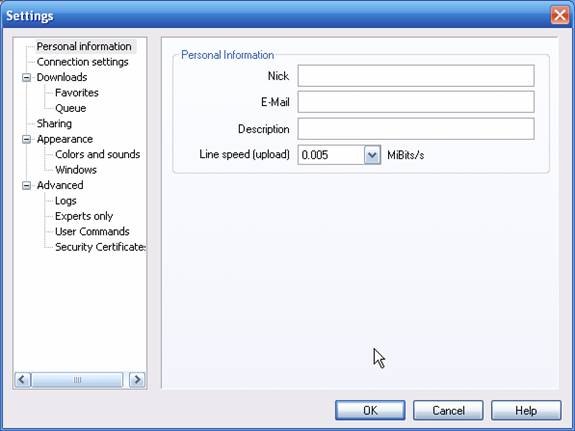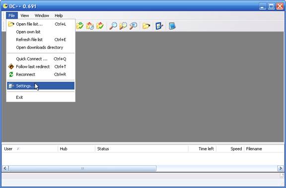 Lansati aplicatia (Start / Program files / DC++ / DC++). Selectati din meniul File optiunea Settings.