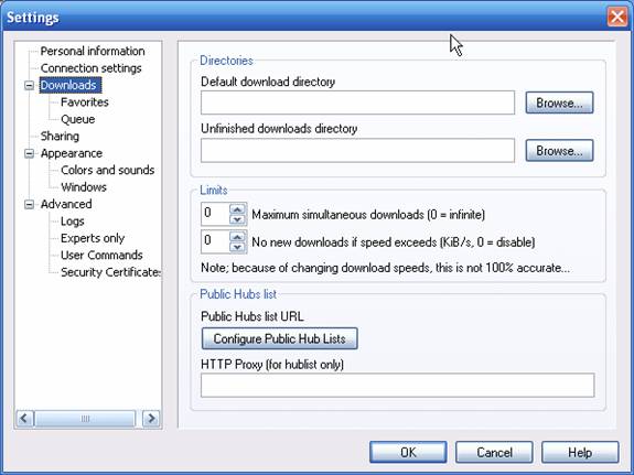 Unfinished downloads directory (Browse) - daca doriti sa specificati o alta locatie pentru fisierele descarcate partial, selectati prin apasarea butonului Browse. Locatia implicita este locatia DC++ aleasa la instalare.