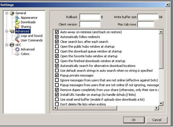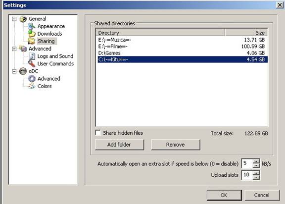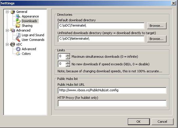 Aici aveti posibilitatea sa alegeti directoare unde sa va faca transferul de fisiere complete si cele care sunt in curs de dowl si sa adaugati o lista de descarcare a huburilor publice "vezi Public hubs list URL.