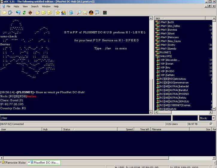 Vedeti bara de sus o iconita albastra "Public Hubs "apasati pe ea si se va deschide o fereastra unde vor apare adresele de huburi ce sunt in acea lista. Este suficient sa dati dublu clic pe unul din huburi si deaja clientul dumneavostra DC se va conecta .Este posibil sa nu intrati pe un server sau altu deoarece nu aveti numarul de sloturi ,nick name incorect ,serverul sa fie picat sau nu aveti cantitatea de share ce se cere pe acea adresa.