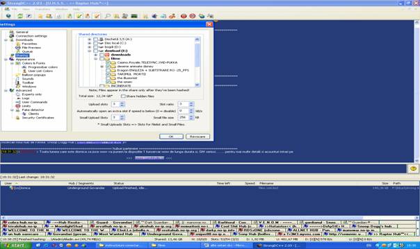 treci la sharing si in dreapta ai toate folderele tale. O sa vezi ca unele huburi au ca si conditie principala ca sa te poti conecta de ex. Share 5 gb. De acea vei bifa ceea ce vrei sa sheruiesti. Nu serui C-ul, dcc-ul si alte foldere care nu vrei sa se vada pe huburi