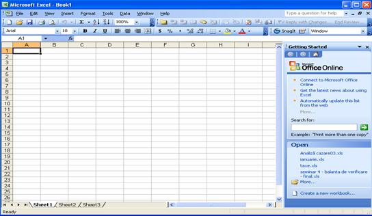 Multe elemente din fereastra aplicatiei Excel sunt similare cu cele intalnite in celelalte programe din suita Microsoft Office. Imaginea urmatoare evidentiaza componentele principale ale unui document Excel: fereastra registrului de lucru, bara de meniu principal, bara de formule, barele de instrumente Standard si Formatare si panoul de activitate.