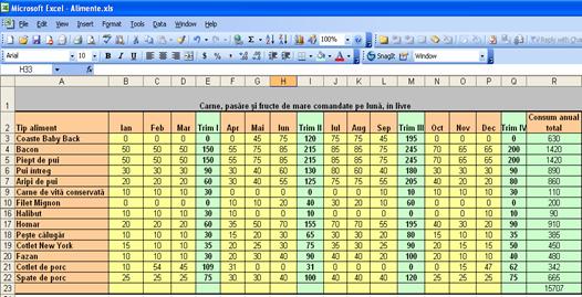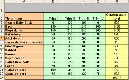 In tabelul urmator se prezinta o situatie a alimentelor cumparate intr-un an, pe luni si trimestre.