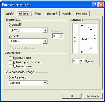 Pentru alinierea continutului celulelor capetelor de tabel, se va folosi cāmpul Format Celule Aliniere. Se alege optiunea de aliniere Centru, atāt pe orizontala cāt si pe verticala. La fel se va proceda pentru toate tabele vezi figura 6.