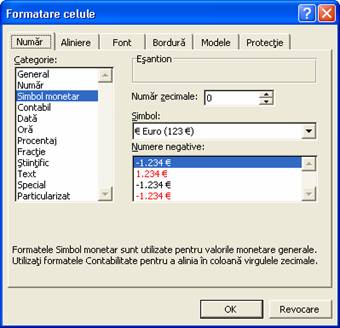 Pentru formatarea cu separatori de mii, sau pentru alegerea formatului Simbol monetar se va folosi cāmpul Format Celule Numar. Īn figurile 11 si 12 se poate vedea ce setari au fost alese pentru formatarea īn sistem Simbol monetar, respectiv cu separatori de mii.