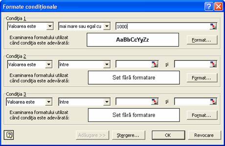 Pentru formatarea conditionala, se va utiliza cāmpul Format Formate conditionale. Dupa cum se poate vedea īn figura 13, pentru o celula se pot preciza un numar maxim de trei conditii de formatare, īntre care opereaza o relatia logica de tip SAU.