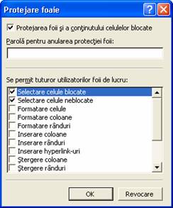 Se foloseste cāmpul Instrumente Protectie Protejare foaie (se poate alege varianta Protejare registru de lucru, caz īn care se va proteja īntregul document si nu numai foaia de calcul curenta) si se ajunge astfel la caseta de dialog Protejare foaie - vezi figura 17. Aici se poate preciza (nu este obligatoriu) si o parola care ar fi solicitata la de-protejarea foii (documentului) - atentie, parola odata uitata, nu exista nici o posibilitate de a mai face foaia (sau documentul) editabila - sau se poate preciza la nivel de amanunt ce operatii mai pot fi executate asupra foii protejate.