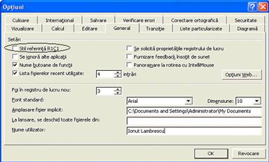 Se propune reluarea exercitiului cu schimbarea stilului de adresare. Astfel īn loc de stilul de adresare A1, implicit, se va utiliza stilul de adresare R1C1. Schimbarea stilului de adresare se poate face cu ajutorul casetei de dialog Optiuni, sectiunea General (vezi figura 18). Zona de interes Setari Stil referinta R1C1 este evidentiata īn figura 18.