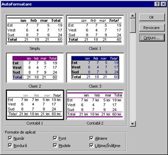 Pentru a utiliza numai anumite setari dintr-un autoformat, se face click pe Optiuni, apoi se deselecteaza casetele de control pentru elementele care nu vor fi aplicate autoformatului (Numar - pentru formatul de numere, Font - pentru font, Aliniere - pentru aliniere, Bordura - pentru chenare, Modele - pentru modele de umplere si culoarea fundalului si Latime/Īnaltime - pentru latimea coloanelor/īnaltimea rāndurilor.
