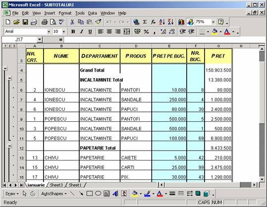 De multe ori, atunci cand creezi o lista, este necesar sa efectuezi subtotaluri pentru diferitele categorii de date continute.Subtotalurile pot fi calculate folsind functiile SUM, COUNT, MIN, MAX si altele.