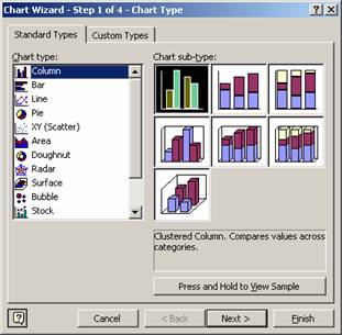 Primul pas in crearea unei diagrame este alegerea tipului diagramei. Pentru a utiliza unul din tipurile predefinite de diagrama trebuie sa executi click pe unul din tipurile de diagrame (Chart Type) din sectiunea din stanga a primei casete de dialog. Aplicatia Excel ofera o gama larga de tipuri de diagrame, tipuri pe care le gasesti enumerate in continuare.