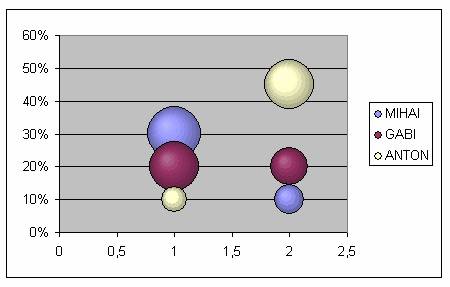 Diagrame cu bule (Bubble). Diagramele cu bule compara valorile in seturi de cate trei. Primele doua seturi sunt folosite in diagrama, al treilea determinand dimensiunea bulelor.