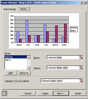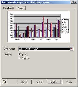 Dupa ce ai stabilit tipul de diagrama apesi butonul Next din caseta Chart Type si se va deschide a doua caseta din succesiune, care se numeste Chart Source Date.