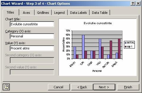 Titlurile diagramelor (Title) iti permite sa introduci un titlu pentru diagrama, pentru axa categoriilor si cea a valorilor. Este bine sa completezi toate campurile acestei fise.