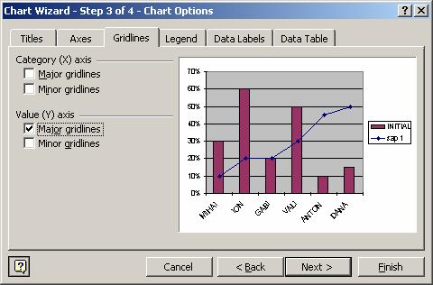 Linii de grila (Gridlines) iti permite sa adaugi pe axe linii de grila majore sau minore. Ca sa obti o diagrama curata, neaglomerata, este mai bine sa eviti liniile de grila. In mod normal se pastraza liniile de grila majore pentru axa Y sau Z fara a aplica linii suplimentare de grila.