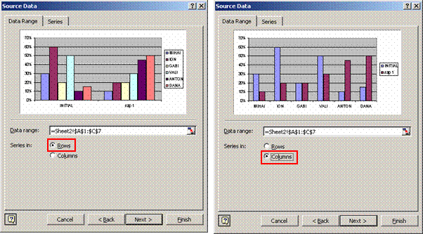 Dupa ce ai stabilit tipul de diagrama apesi butonul Next din caseta Chart Type si se va deschide a doua caseta din succesiune, care se numeste Chart Source Date.