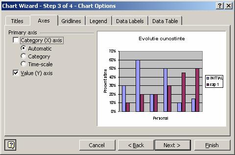Axe (Axa) Afiseaza automat datele īntr-un format de scara de timp daca acestea sunt formatate ca date de timp. Prin deselectarea optiunii Category (X) Axis poti elimina etichetele axei. Atunci cānd optiunea este selectata, butonul radio selectat sub optiune indica ce va afisa axa.