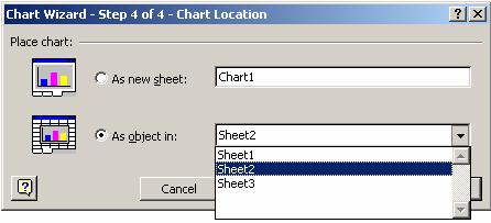 Alegerea unei locatii pentru diagrama reprezinta pasul al patrulea al aplicatiei Chart Wizard. Din aceasta caseta poti alege urmatoarele optiuni, ca sa specifici unde doresti sa amplasezi noua diagrama: