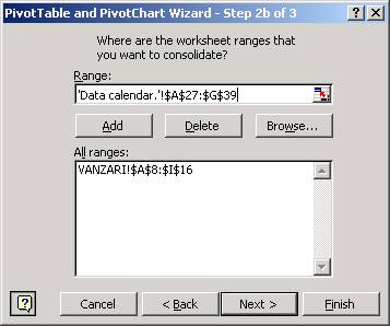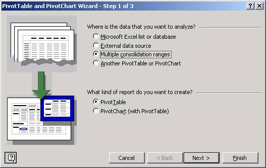 Excel īti permite sa creezi tabele pivot pe baza mai multor domenii de centralizare daca selectezi controlul pentru zone multiple de centralizare din pasul 1 al aplicatiei Pivot Table Wizard. De exemplu, daca ai vānzarile de produse pe doua companii sau doua departamente, poti stabili foi de calcul sau baze de date separate pentru liste, 424i89e pe care apoi sa le combini īntr-un singur tabel pivot centralizator. Pentru aceasta īn primul pas al aplicatiei Pivot Table Wizard trebuie sa selectezi optiunea Multiple consolidation ranges.