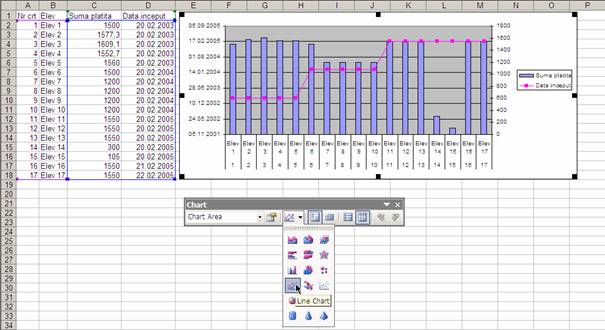 Din meniul Format se acceseaza Selected data series. De la tabul Axis se alege secondary series. Cu aceeasi serie selectata se face chart de tip line din Chart toolbar.