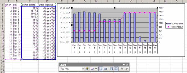 Pentru a construi un grafic cu o axa principala si una secundara se selecteaza tabelul respectiv si se apasa butonul de Chart wizard de pe bara. Se completeaza cei 4 pasi. Se selecteaza seria secundara in grafic.