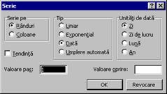 Buonul de optiune Data selectat creeaza o serie cu date calendaristice. Tipul de incrementare a seriilor de date calendaristice depinde de optiunea selectata în zona Unitati de data