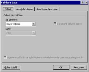 Când se face click pe Golire totala, se sterg toate selectiile si informatiile din toate cele trei tab-uri ale casetei de dialog Validare date. Pentru a reface efectul lui Golire totala se face click pe Revocare