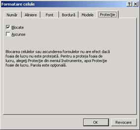 - caseta de control Cuprins - pentru ca ca alt utilizator sa nu poata modifica continutul celulelor foii lucru si pentru a nu putea vizualiza rândurile, coloanele sau formulele ascunse;