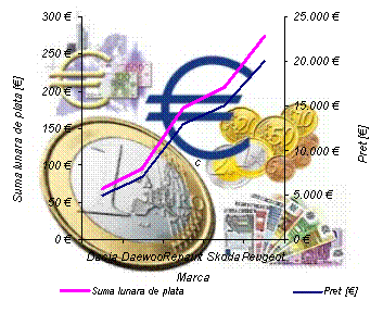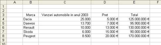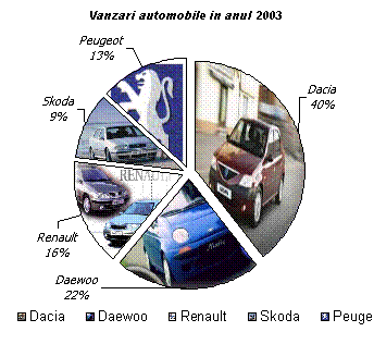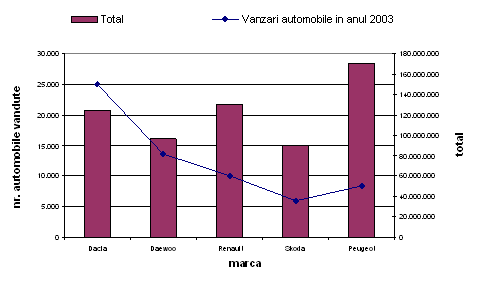 Sa se completeze tabelul de valori cu datele din figura 3 (câmpurile Pret si Total, unde Total = Pret * Vânzari automobile în anul 2003) si sa se modifice reprezentarea grafica de mai sus astfel încât sa se realizeze diagrama din figura 4.
