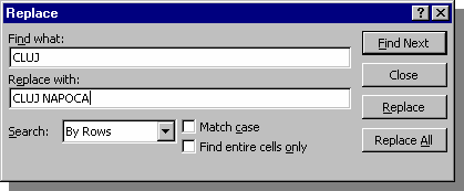 Daca dupa introducerea datelor într-o foaie de calcul ne-am dat seama ca un cuvânt a fost tastat gresit (de obicei numele de persoane pot fi tastate gresit - spre exemplu am tastat CLUJ în loc de CLUJ-NAPOCA), putem sa indicam programului sa caute cuvântul gresit si sa-l înlocuie cu cel corect. Se mai pot gasi si modifica date în formule, precum si textele din comentarii (care pot fi doar gasite, nu si înlocuite automat).