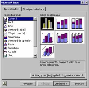 Se selecteaza tipul de diagrama dorit, apoi se face click pe Urmatorul (se afiseaza caseta de dialog Expert diagrama - Pasul 2 din 4