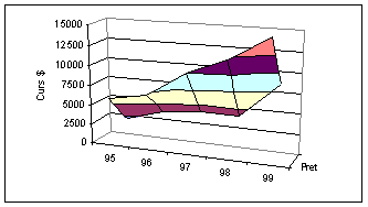 - În caseta Rotatie se introduce o valoare pentru a controla rotatia suprafetei de reprezentare grafica în jurul axei z (axa verticala). Rotatia este masurata în grade, de la 0 la 360. Pentru diagramele de tip bara 3-D, rotatia variaza de la 0 (zero) pâna la 44 de grade.