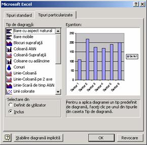 tipurile de diagrame incluse, definite de utilizator sau particularizate, pe care le furnizeaza Microsoft Excel (tab-ul Tipuri particularizate