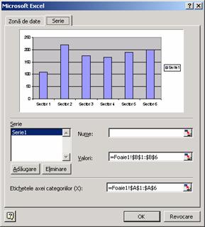 - Butonul de comanda Adaugare adauga la diagrama o serie noua de date necompletate. Pentru a adauga numele seriei, se face click în caseta Nume apoi se selecteaza o zona a foii de lucru, sau se tasteaza numele în caseta.