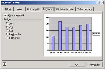 - Butoanele de optiune din zona Pozitie Jos Colt Sus La dreapta La stânga) plaseaza legenda selectata în pozitia dorita si redimensioneaza suprafata reprezentata grafic pentru a aseza legenda.