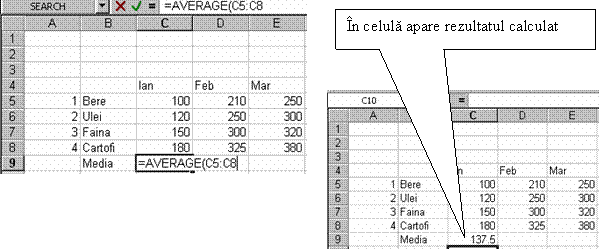 Formulele permit efectuarea calculelor, in cadrul foii de calcul. Cand folositi formule, Excel va recalcula automat rezultatul la orice modificare a valorilor numerice care participa la respectivul calcul. Formulele pot fi introduse direct in celula sau indicand celulele cu care opereaza formula.
