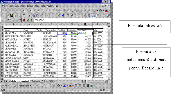 Observatie: Când scriem o formula care utilizeaza adrese relative, aceste adrese se modifica singure la copierea formulei, dupa cum se observa si din figura ce urmeaza.