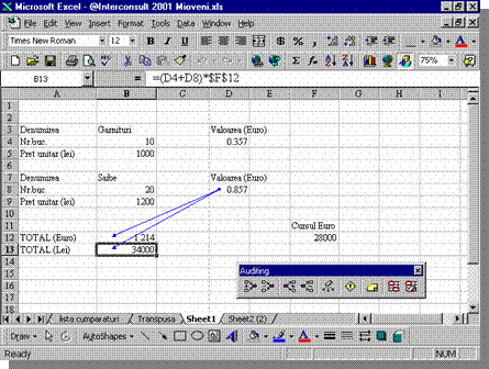 In cazul formulelor complicate scrise mai demult, s-ar putea sa fie nevoie sa ne reamintim modul în care au fost create. Pentru aceasta MS EXCEL pune la dispozitia noastra procedura de Audit a unei formule, care ne arata care sunt celulele folosite în formula si care sunt celulele dependente de aceasta formula.