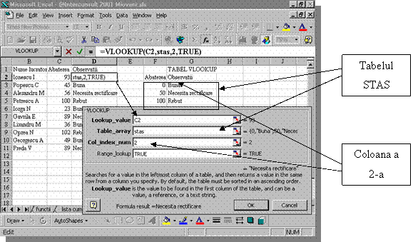 f) La optiunea Table_array scriem numele tabelului de cautare, pe care l-am numit STAS; acest tabel îl mai puteam selecta cu mouse-ul, daca nu dorim sa-i dam un nume