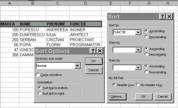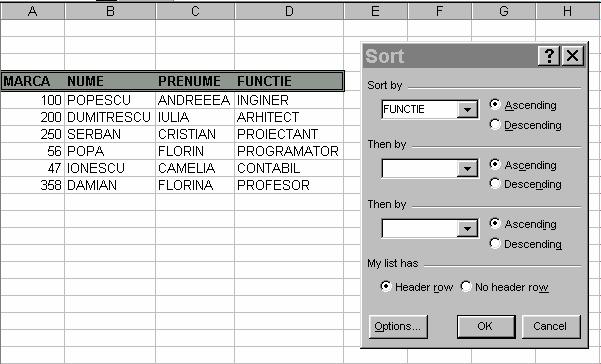 Daca lista are nume de campuri , se selecteaza butonul Header Row pentru ca numele de campuri sa nu fie sortate odata cu datele ( In caz contrar No Header Row ).