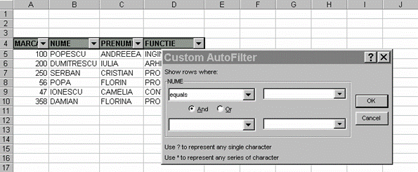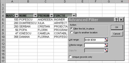 Excel compara criteriile aflate sub un nume de camp, in domeniul de criterii cu datele aflate sub acelasi nume de camp din lista;