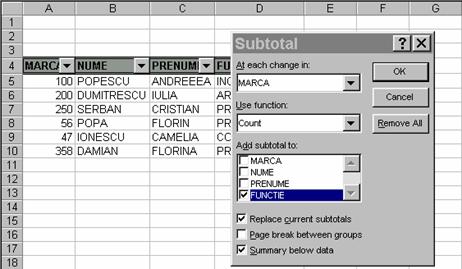 Se selecteaza datele cu care dorim sa se efectueze calculele din caseta Add Subtotal To;