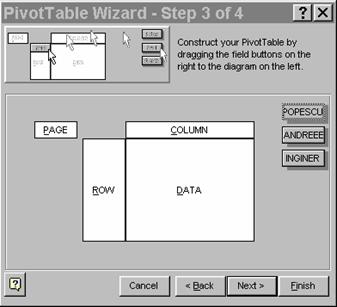 v se pot introduce totaluri si subtotaluri , iar pentru inchiderea tabelului pivot se alege FINISH.