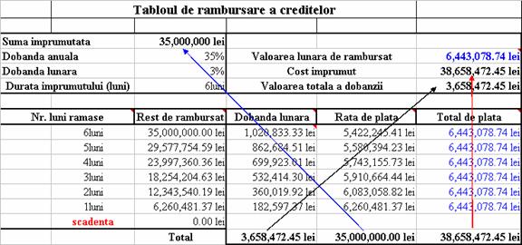 Un intreprinzator particular solicita unei banci un imprumut de 15.000.000 lei pentru a efectua o investitie. Banca acorda creditul pe o durata de 6 luni, cu o dobanda anuala de 60%.