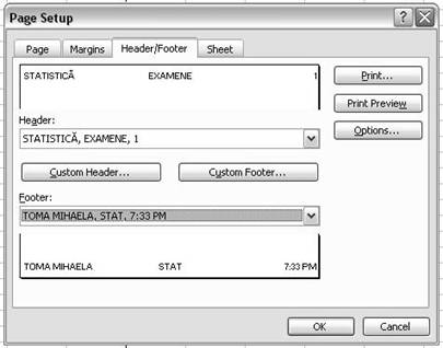 Realizati un subsol care sa contina: in stanga numele vostru, centrat numele foii de calcul, in dreapta data si ora curenta.