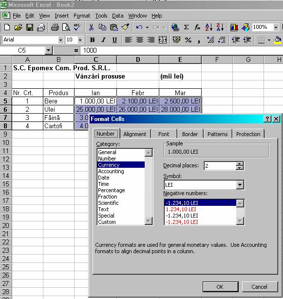 Efectuati clic pe Category Currency din rubrica Number a casetei de dialog Format Cells