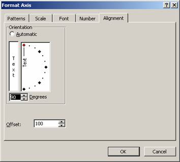 Similar formatarii 151f54b axei valorilor, formatarea axei categoriilor (X) poate atrage sau īndeparta atentia de la aceasta axa. De exemplu, daca ai mai multe date calendaristice pe axa categoriilor, este bine sa folosesti alinierea verticala, astfel īncāt programul Excel sa treaca automat textul pe rāndul urmator sau sa schimbe numarul de etichete afisate. Pentru a realiza acest tip de modificare, foloseste parametrii din sectiunea Orientation din fisa Alignment a casetei de dialog Format Axis. Prin alinierea corecta a informatiilor si formatarea dimensiunii textului, poti face vizibile īn diagrame toate etichetele.