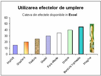 Efectele de umplere īti permit sa utilizezi culori, modele, umpleri gradate si imagini īn interiorul seriilor de date, al zonei de reprezentare al obiectelor desenate si asa mai departe. Fisa Patterns īti ofera o multitudine de posibilitati pentru selectarea bordurii, a culorii, a modelului si altele.
